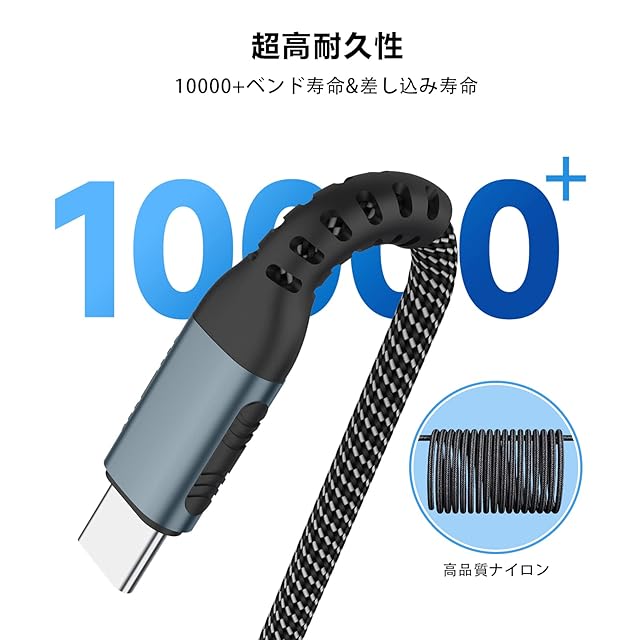 【耐久性と柔軟性を両立】USB Type C ケーブルは、コンパクトで信頼できるアルミニウム合金シェルとナイロン編まれたケーブルを使っている優れた高品質製品を提供します。ナイロンファイバー被覆構造で10000回以上の折り曲げ試験に合格し、一般的なUSBケーブルより寿命を4倍以上に向上する高耐久Type C ケーブルです。