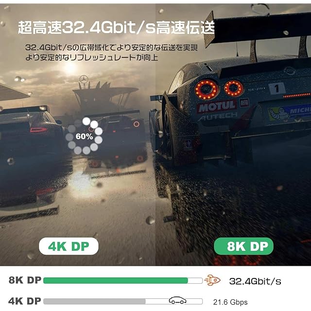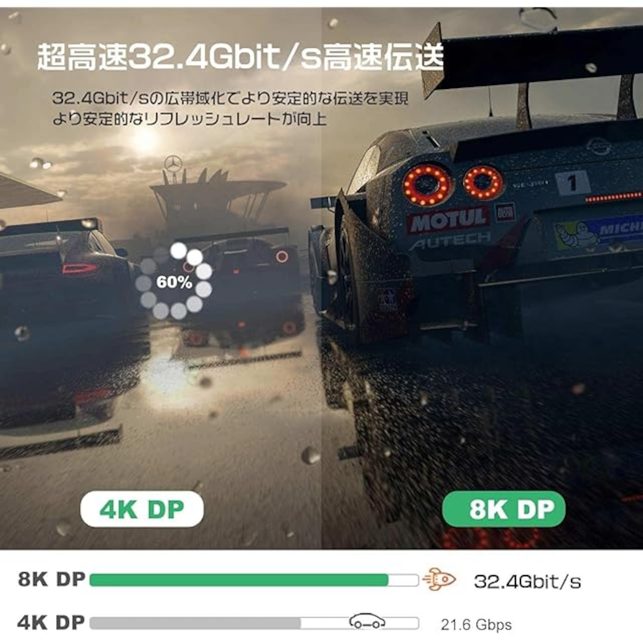 32.4Gbps高速伝送 : 最大32.4Gbpsの高速伝送を実現できます。DisplayPort 1.2規格と比べ、displayport 1.4バージョンは1.5倍速く。さらに高いリフレッシュレートを実現でき、画面のティアリングやフレームレートの不安定さを排除、破綻のない滑らかな画面表示が不可欠な一品だ。最大32.4の非圧縮デジタル音声チャネル、1536kHz/24bit までのオーディオストリームに対応の8Kディスプレイポートケーブルです。8K@60Hzの高いリフレッシュレートにより、驚きに満ちたゲーム体験を楽しんでください。複製モードと拡張モードも対応しますので、ご使用環境によって自由に転換できます。注意:32.4Gbpsハイスピードに対応した機器が必要です。