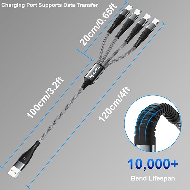 【2本セット】 4 in 1高耐久編組ナイロン多機能充電ケーブル、USB急速充電ケーブル、4種類のインターフェースTypeC*4 を持ち、4台の設備の同時充電をサポートしPhone15/Switch/Google Pixel/Nexus5 X6P/Samsung S8+/note8/Xperia,Galaxy/LG (グレー) | AVENIR