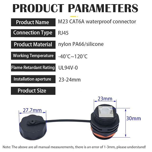 <b>仕様:</b><br> 接続タイプ: RJ45<br> 伝送カテゴリー:CAT6A<br> シェル素材: ナイロン PA66<br> 防水ゴムリング:シリコン<br> 使用温度: -40℃~120℃<br> 難燃性評価:UL94V-0<br> 取り付け口径: 23-24mm<br> 保護等級:IP68(防塵・防水キャップ付き)<br> <br> <b>機能:</b><br> IP68防水<br> 産業環境でデータおよび PoE 用のパススルー CAT6A イーサネット接続を提供します。 <br> シェルには難燃性の高いナイロンPA66を採用<br> Cat6/Cat5E/Cat5 イーサネット ケーブルと互換性があり、最大 10Gbps の転送速度を実現します。<br> メス/メスドッキング用シールド産業用パネルマウント<br> はんだ付け不要、取り付けに工具不要、プラグアンドプレイ<br> 接続を切断したり中断したりする必要がなく、信号の劣化もありません。<br> <b>含まれるパッケージ:</b><br> 1 個の RJ45 CAT6A コネクタ<br> <br> <b>アフターサービス</b><br> 当社の専門のカスタマーサービスチームがアフターセールスの問題を解決いたします。<br> ぜひご購入ください。 初期不良の可能性がございますので、まずは当店までご連絡ください。<br> 交換または返金対応させていただきます。
