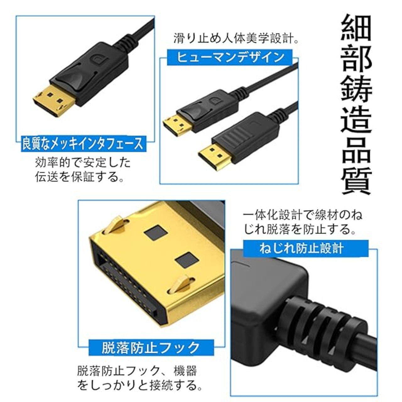 【幅広い用途&持ち運びに便利】DisplayPort(DP,DP++,DisplayPort++)を搭載したパソコンをDisplayPortケーブルでDisplayPort入力を搭載したHDTV、モニタ、またはプロジェクタに接続することができ、使用機器の画面拡張やコピーを実現することができる。コンパクトで持ち運びに便利。ホームシアターや会社の講演、教室の授業など、さまざまなシーンで大活躍。<br>【4 K高解像度】本Displayportケーブルは最大4 K(3840 x 2160)Ultra HDの解像度をサポートし、オーディオは非圧縮デジタル7.1、5.1または2チャンネルを通過することができる。<br>【優れた耐久性】表示ポートケーブルは耐食性金メッキコネクタ、純銅導体と箔&編組シールドの組み合わせを採用し、ケーブルの性能を高め、誤りのないデータ転送を実現し、長期使用しても酸化などによる接触不良、信号劣化の心配がなく、優れた耐久性を確保した。<br>【ラッチ設計】安全な接続を確保するために、DPケーブルは脱落防止ラッチ付きコネクタを採用し、DisplayPortコネクタを取り外す際にリリースボタンを押す必要がある。<br>【操作簡単】本ディスプレイポートケーブルはドライバや電源などは不要で、差し込むだけで使用できます。
