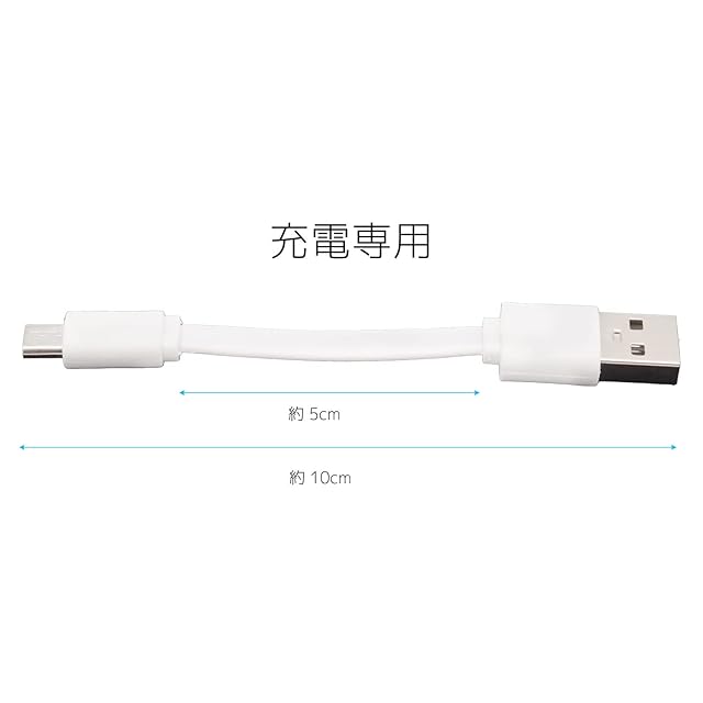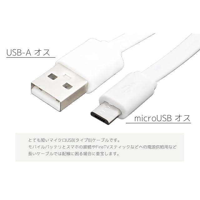USB-A オス - マイクロB オス フラットケーブル<br />とても短いマイクロUSB(タイプB)ケーブルです。モバイルバッテリとスマホの接続やFireTVスティックなどへの電源供給用など長いケーブルでは配線に困る場合に重宝です<br />当ケーブルは充電専用です【データ通信は行えません】<br />●ケーブル長 約 5cm (コネクタ含まず・端子を含む長さは約10cm)<br />●製品内容 microUSBケーブル 10cm × 1 ●保証期間 お届け日より1ヶ月