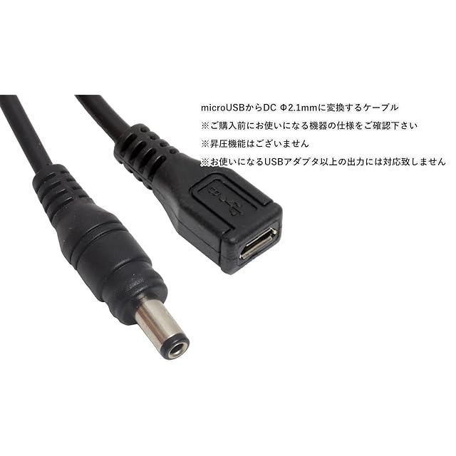 DCプラグ φ5.5mm×2.1mm ⇔ USBマイクロBタイプソケット 変換ケーブル 【当ケーブルには電流・電圧を調整する機能はございません。ご利用方法によりましては端子規格の上限を超える電圧または電流が負荷へ流れます。電気的な知識に明るくない方やご利用前の計測が行えないかたはご遠慮ください。機器破損の恐れがございます】