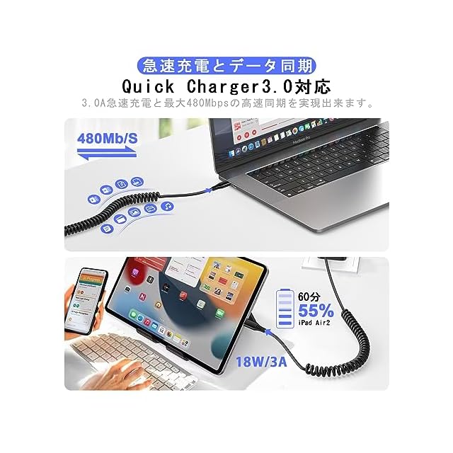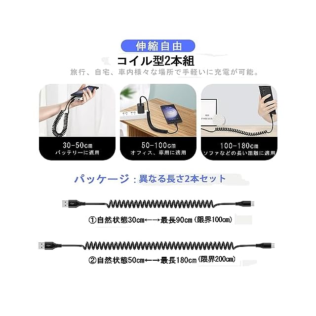 【伸びるType-Cカールケーブル】USB-A to Type-Cコイル型デザインの充電ケーブルで、コイル形状のデザインで、持ち運びや保管が簡単で、使いやすく、ケーブルを乱雑にせずに整頓するのに役立ちます。寝室、ソファ、オフィス、旅行中、車内など、さまざまな場所で手軽に充電が可能です。