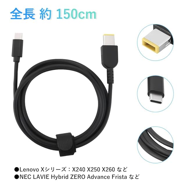 USB-C電源アダプター(20V/3.25A以上のパワールールに沿ったUSB-PD対応必須)Lenovo NEC の角型充電ジャック-USB-C用充電ケーブル(USB Power Delivery専用) 【PowerProfile(パワープロファイル)世代のUSB-PD充電器はご利用いただけません。PowerRule(パワールール)規格且つ20V-3.25A対応の充電器をご利用ください。記載内容が不明な場合には当製品のご利用は推奨いたしません。機器を破損する恐れがあります】<br />65Wまたは87W Type-C充電器と一緒に使用して、コンセントからDC 18V-20Vポートでノートパソコンを便利に充電できます<br />全長 約 150cm<br />●Lenovo Xシリーズ:X240 X250 X260 など●NEC LAVIE Hybrid ZERO Advance Frista など ●プラグ スクエア型 ●プラグサイズ 約 幅11mm 高さ 4.5mm<br />●製品内容 ノートパソコン用電源ケーブル × 1点●保証期間 お届け日より1ヶ月
