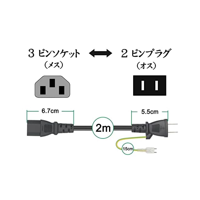 【コネクター形状】ACアダプター側:3ピンソケットC13(メス)、ACコンセント側:2ピン(アース線付き)プラグ(オス)。ケーブル長:2.0m,アース線の長さ:15cm。重要な電源の入れ替わっ線として、3ピンプラグのモニター、コンピューター、ゲーム機、コピー機、プリンターなど家用電器には適用します。