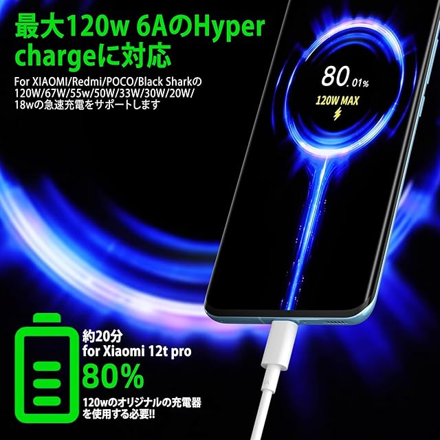 120W USB-C ケーブル:主に対応Xiaomi製品向けになっています、最大120W (20V×6A)まで安全かつ安定して出力できます。TITACUTEのUSB Cケーブルは、対応Redmi Note 11/Xiaomi 12 11 T Proなどのシリーズスマホへの急速充電が可能です。約25分時間で、対応Xiaomi 12T Proを満充電することが可能です。((※Mi純正充電器使用時で120W急速充電対応端末の時のみ.for Xiaomi以外のスマホでも120Wではありませんが高速充電出来ることが多いのでオススメです。パッケージには含まれていません)