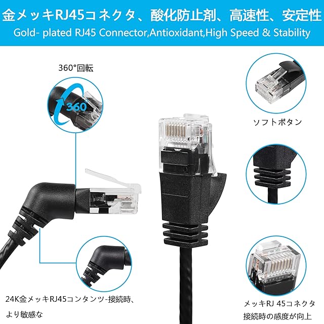 【360度回転】CAT6Aイーサネットケーブルのエルボーインターフェイスは、1つの角度に限らず360度回転させることができ、方向を柔軟に調整することができます