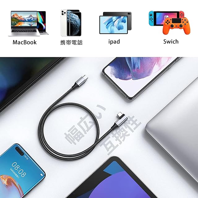 【L字型コネクター設計】ケーブルは、革新的な 90 度 L 型デザインを特徴としており、直角コネクタを簡単に接続および切断できます。横向きにして充電したり、ゲームしたり、手の動きを妨げない、スタンドやカバンに置いても便利になります。
