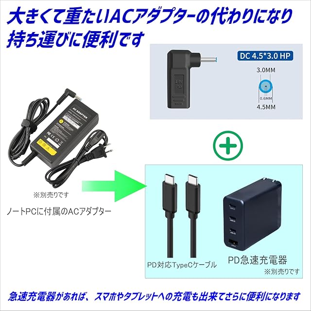 ヒューレットパッカード hp (外径4.5mm/内径3.0mm)プラグをTypeCに変換して、急速充電器(PD対応)に接続し給電する変換ケーブル。