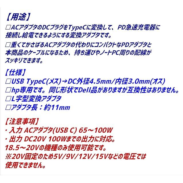 【特徴】<BR>■ヒューレットパッカード hp (外径4.5mm/内径3.0mm)プラグをTypeCに変換して、急速充電器(PD対応)に接続し給電する変換ケーブル。 <br> ※PDケーブル(TypeC)との併用となります。<BR>■重くてかさばるACアダプタの代わりにコンパクトなPDアダプタとこのケーブルとPDケーブルになり、持ち運びやノートPC周りの配線がスッキリできます。<br> 【対応機種】<br> ■ヒューレットパッカード hp (外径4.5mm/内径3.0mm)プラグ採用の 65W(20V-3.25A)以上のACアダプタを採用している機種のみに使用できます。<br> <br> ※近似サイズに内径が7.4mmや4.8mmなどがありますが使用できません。<br> ※同じサイズでDELLの機種がありますが使用できません。<br> <br> ※トラブルの多くがPD充電器の出力がパソコンの要求電力を満たしていないという現象のようです。PD機器の仕様を必ずご確認ください。<br> ※モバイルバッテリーで20V未満の出力製品では動作しません。<br> ※TypeCケーブルもPD対応品である必要があります。<br> <br> 【仕様】<br> ■数量:1ケ<br> ■USB TypeC(メス)→ヒューレットパッカード hp <br> 外径4.5mm/内径3.0mm(オス)変換アダプタ<br>■プラグ長:約11mm<br>■ケーブル長:約15cm<br> ■対応電圧:<br> ・入力 ACアダプタ (USB C) 65W~100W <br> ・出力 DC20V 最大65Wの出力可能 18.5~20Vの機器のみ使用可能<br> <br> ※20V出力固定のため5V/9V/12V/15Vなどは使用できません。<br> ※ヒューレットパッカード hp の認証品ではありません。汎用品のため動作を保証するものではありません。 <br> <br> ■梱包形態:ビニール袋による簡易梱包<BR> (ロットにより写真と異なる場合がございます) <br> <br> 【保証】 <br> 初期不良交換1か月以内のみ <br> ※どのような事例であっても商品代金を超える保証はございません。<br>