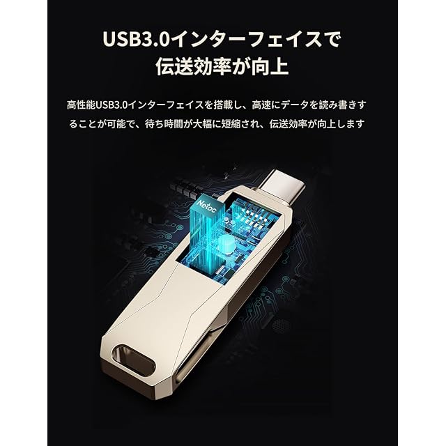 Netac USBメモリ 128GB 2in1 USB3.1/3.0・タイプc 高速メモリー 大容量フラッシュメモリ 外付けメモリ 小型 360度回転式 スマホ用 Mac Windows PC Pad対応 合金製 傷に強く 頑丈 耐衝撃 携帯便利 | AVENIR