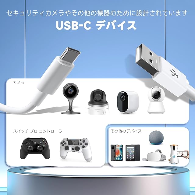 [幅広い互換性]--- USB-C対応のセキュリティカメラやその他のデバイス(携帯電話、タブレット、Switch Proコントローラーなど)を標準のUSB-A対応デバイス(ラップトップ、パワーバンク、壁掛け充電器など)に接続します。Type-CコネクタをType-C対応デバイスに簡単に挿入できます(どちら側が上であるかは関係ありません)。