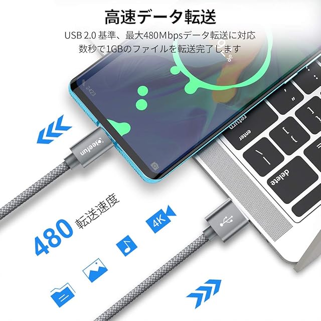 【急速充電&高速データ転送】このusbケーブル type-cはQC3.0対応と最大3A電流通過支持なので、普通の充電時間より40%速い急速充電可能です。また、USB 2.0により最大480Mbpsのデータ転送速度をサポートし、高速データ通信が可能です。