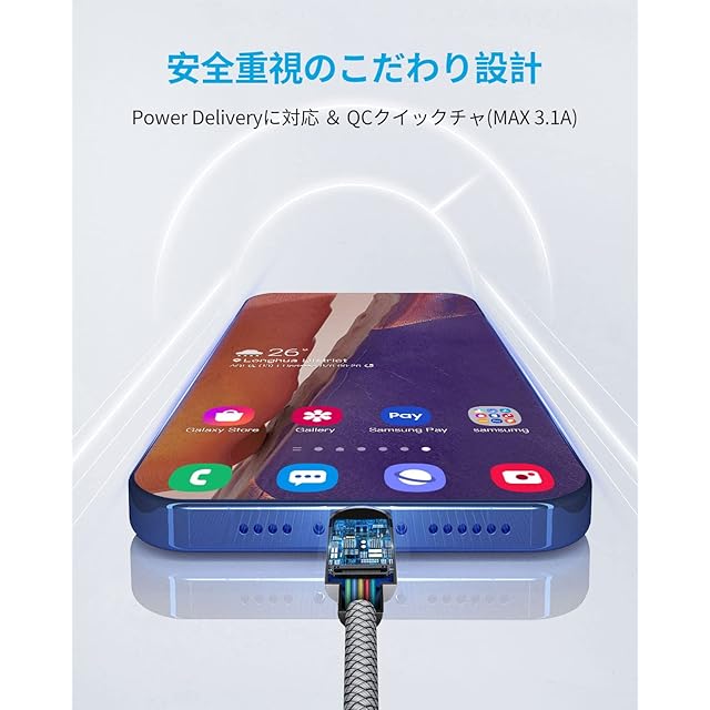 【安全充電保護】USB-C ケーブル内部は安全性と信頼性の向上のため、56kΩレジスタの実装によりデバイスを短絡、過充電、過熱などから高安全保護します。上質銅心線を内蔵し、電気抵抗が低く、最も安定充電をお楽しみください。