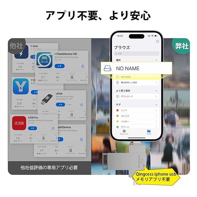 【スマホ容量不足・icould課金対策】何気なくiPhoneを使っていると、突然「iCloudストレージの空き領域が不足しています」と表示されたことはありませんか? こんなメッセージが表示されると、「大事な写真を消すしかないのか」、あるいは「課金するしかないのか」と心配になる方もきっといます。Qingcess社のiPhone対応 usbメモリを使用して、この悩みをすぐに解消、usbメモリ 128gb 、usbメモリ256gb、二つ大容量usbメモリがあるので、簡単にスマホの容量を増えます。usbメモリの各部品や機能性も厳格なテストを完了しました。耐久性も安全性も全然心配ありません。コンパクトで持ち運びやすいので、仕事や生活、出先、旅先などにも便利で、インターネットが必要ないので、飛行機でもUSBメモリを使って動画を視聴できます。無期限のカスタマーサポートで、万が一商品の使用方法がわからない等、何かお困りな問題、例え箱潰れ、付属品破損でも無料で商品交換を対応致します。ご不明な点がありましたら、弊店にご連絡頂ければ12時間以内に問題を解決します。