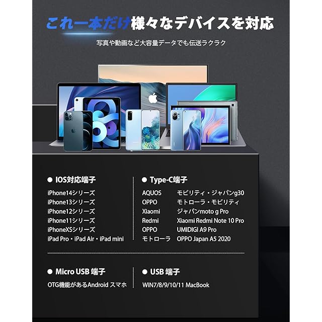 「急速データ転送・USB3.0 USB メモリ 」Qincess社の usbはUSB3.0チップを採用し、パソコンへの転送スピードがアップし、急速データを移行することも可能です。iPhone 14 Pro Max/14 Pro/14 Plus/14/SE 3/13 Pro Max/13 Pro /13/13 mini /12 Pro Max/12 Pro/12 /SE 2 /11 Pro Max/11 Pro/11 /XR/XS Max/XS /X /8 Plus/8/7 Plus/7/SE 1/6s Plus /6s/6 Plus/6/ iPad Pro(第1/2/3/4/5/6世代)/ iPad Air(第1/2/3/4/5世代)/ MacBook(Pro/Air)/ iPad mini(第1/2/3/4/5世代)/ iPad(第5/6/7/8/9世代)/ PC /ノートパソコン/ Type-C機種などと互換性があります。互換性が高く、一個3役のiPhone用USBメモリです。