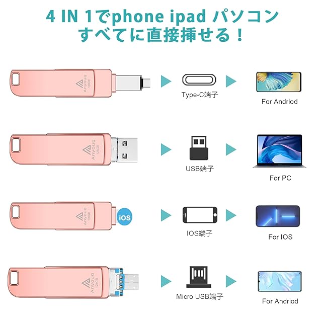 【専用アプリ必要なし】128GB usbメモリ OTG高速4in1 Phone usbメモリー フラッシュドライブ アイフォン用 IOS Android PC USB スマホ USB Phone対応 フラッシュドライブ Android パソコン対応 | AVENIR