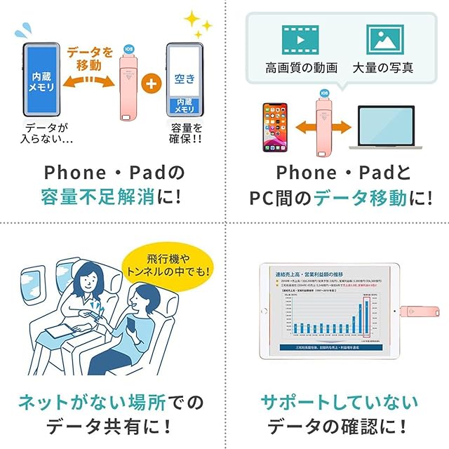 「日本限定・専用アプリが必要なし、挿しだけ使えるusb メモリ」当社のPhone usbメモリは専用アプリのインストールが必要なし、デフォルトの「ファイル」アプリを利用して、挿しだけを使用できます。さらに、USB-A、IOS、MicroUSB、Type-Cが付きので、様々な端末に対応できて、写真・動画・会議の資料を出先でWiFiがない時でもスマホで手軽に見られるので便利です。データ管理がこれ一本!