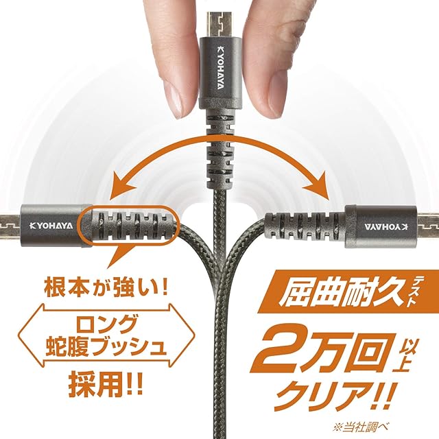 コネクター根本の断線に強い、ロング蛇腹ブッシュを採用。屈曲耐久テストで2万回以上をクリアしていますので長期間使用することが可能です。※当社調べ