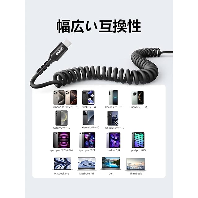 【0.4Mから1.2Mまで伸縮可能】TYPE C コイルコードの自然な長さは0.4mで、場所を取らず、絡まらず持ち運びが簡単です。長さが0.4mから1.2mまで効果的に伸び、柔軟で使いやすいです。伸縮自在!車内、オフィス、デスク周りなど、快適な充電をサポートします!