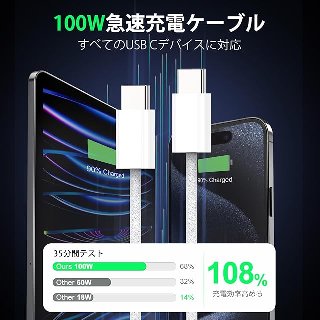 【pd 充電ケーブル タイプc】この type c ケーブルは PD(Power-Delivery)対応により、最大100wの高速充電を対応可能。▲PD充電を実現するためには、デバイスとアダプターがPD機能をサポートしている必要があります。 iPhone16/iPhone16 Plus/iPhone15 Pro/iPhone15 Pro MaxHTC、Xiaomi、Huaweiなど様々なUSB type cデバイスに対応できるスマホ充電ケーブルです。
