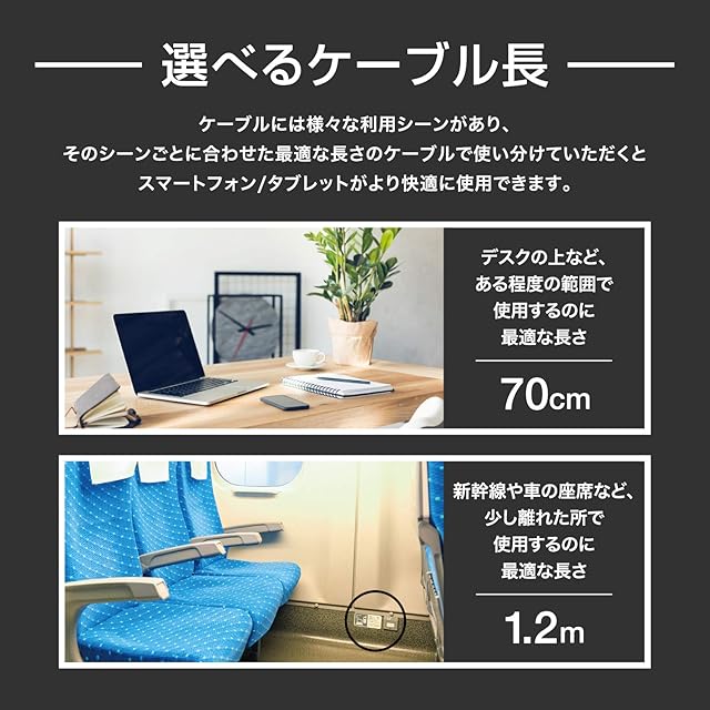 ケーブル内に2重シールドを使用し、高純度線芯を採用することで、導電性の向上により3Aの超急速充電に対応。またケーブル長も70cmと1.2mの長さをカラーもブラック、レッド、ホワイトから利用シーンとお好みでお選びいただけます。