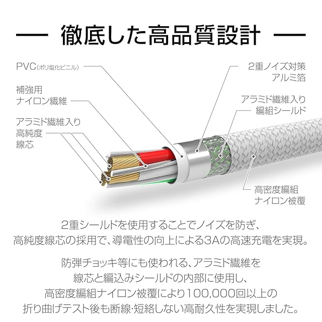 ケーブル内の断線を防ぐ為に防弾チョッキ等にも使われる、アラミド繊維を線芯と編込みシールドの内部に補強素材として使用し、更に外装を高密度に編み上げたナイロン被覆で覆うことにより引っ張りによる耐久80kg以上を実現しました。※当社調べ