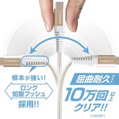 コネクター根本の断線に強い、ロング蛇腹ブッシュを採用。屈曲耐久テストで10万回以上をクリアしていますので長期間使用することが可能です。※当社調べ