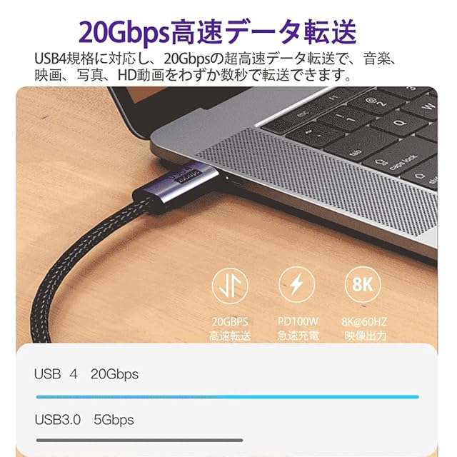 【20Gbps超高速データ転送】このusb cケーブルはUSB 3.2 Gen 2に対応しています。20gbpsまでのデータ転送スピードに対応し、usb3.0の4倍、usb2.0 typec ケーブルの40倍となっております。HD映画をわずか数秒で転送することができます(注:転送速度は、お使いのデバイスポートがサポートする速度に依存します)