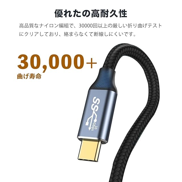 【安全な保護機能搭載】E-markerチップが搭載され、過充電、発熱などから大切な機器を守り、普通のUSBケーブルより寿命を5倍以上に向上するType C ケーブルです。サビなどに強く信号劣化を抑える金メッキピンと難燃性の素材を採用し、安全性を高めています。