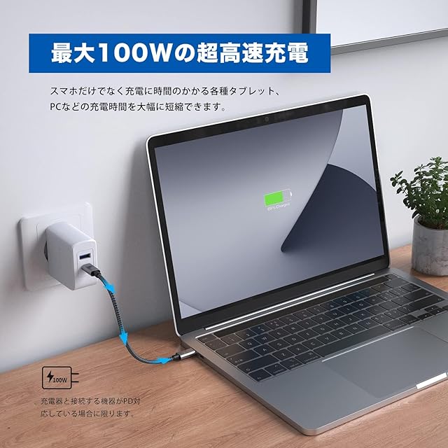 【100W急速充電、L字設計】USB Cケーブルは最大20V/5A (100W)まで安全かつ安定して出力できます。L字のType cケーブル設計、自宅用、職場用、旅行用などいろんな場所で大活躍しています。▲充電器と接続する機器がPD対応している場合に限ります。※ご使用のデバイスにより供給スピードが異なります。