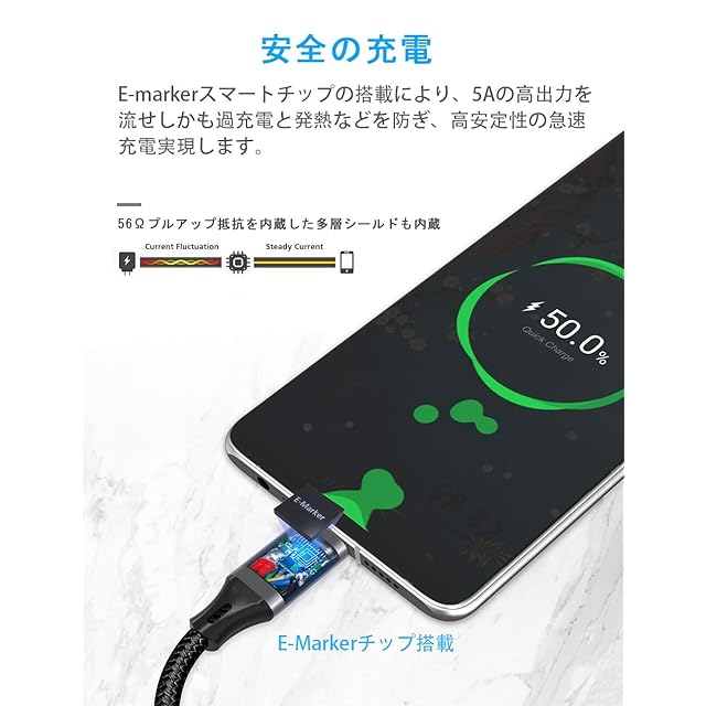 【100W安全で安定した急速充電】Type C ケーブル にはE-Markerチップを搭載し、100W (20V/5A)までのパワー出力でき、素晴らしい急速充電体験をお届けします。E-Markerの充電保護システムにより、安全、安定な急速充電が可能。過充電、発熱などから大切なデバイスを保護し、デバイスの損傷を防止します。