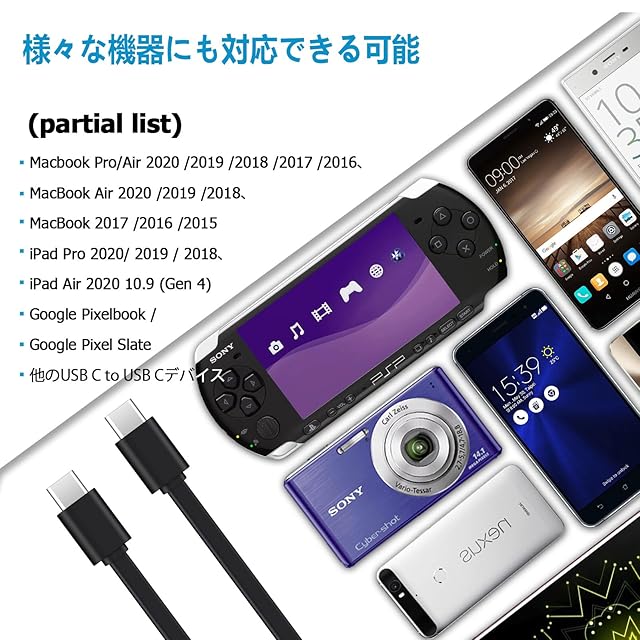 【対応機種】Type C-Type C ケーブルは搭載したスマートホン、パソコン、ゲーム機などに対応。iPhone15シリーズ、iPad Pro 11、iPad Air4/5、Galaxy S24/S23/S22/S21/S20/A55/A54/A53/Note 20/10/9/8/S20 Ultra/S20 FE/Note20/20 Plus/20 Ultra/10/A71/A80/A90 5G、Huawei P30/ P20 Pro/ P10/ Mate10、Google Pixel 5/4/4XL/3a/3a XL/3/3XL/2/2XL、Switch およびtypecポートを備えたその他すべての携帯電話とタブレットと互換性があります。