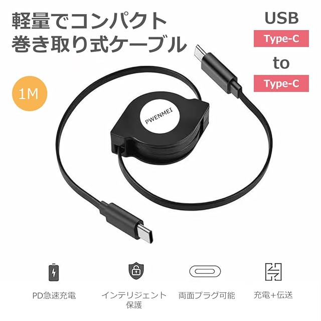 【PD充電&データ転送】このType-C to C 巻取り式ケーブルはUSB PD(Power-Delivery)対応により、最大60W/3Aの高速充電を対応可能。巻き取り式USBケーブルType-CはUSB2.0規格で最大480Mbpsのデータ転送速度に達し、写真やファイルなどの転送はあっという间に完成可能、時間を大幅に節約できます。 (注:映像出力は非対応。)