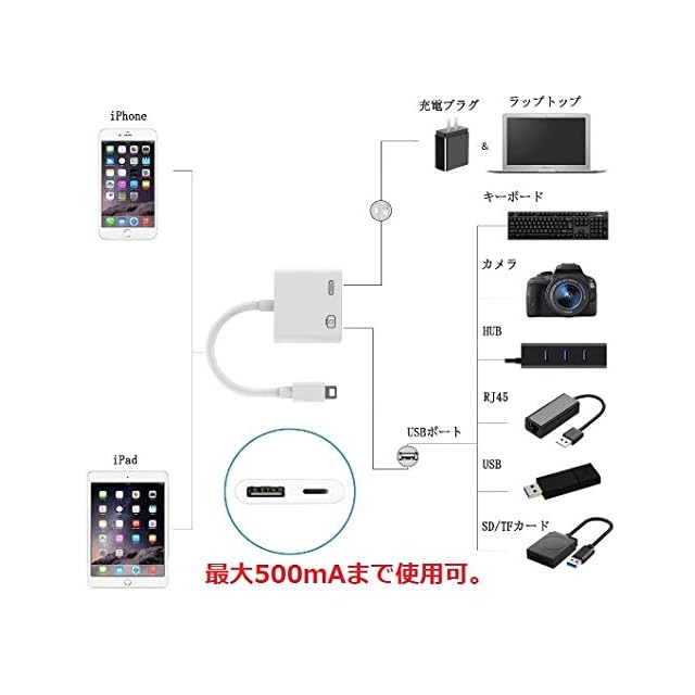 このアダプターをiPhoneに接続すると、USBメモリーに多くの情報が読み書きが可能となります。またキーボード、マウス、カメラ等多くのデバイスと接続できます。