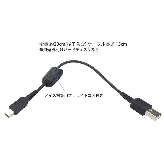 USB A オス - miniB USB オス USB2.0規格 データ転送速度 最大480Mbps ミニUSBケーブル<br />全長 約20cm(端子含む) ケーブル長 約15cm 短い ノイズ対策用フェライトコア付きUSBケーブル<br />●用途 外付けハードディスクなど<br />●製品内容 USB-A-miniUSBケーブル × 1点●保証期間 お届け日より1ヶ月間<br />【ご注意ください】当USBケーブルはminiB(ミニUSB タイプB)ケーブルです。多くのスマートホンで使用されるmicroUSB端子には接続できません