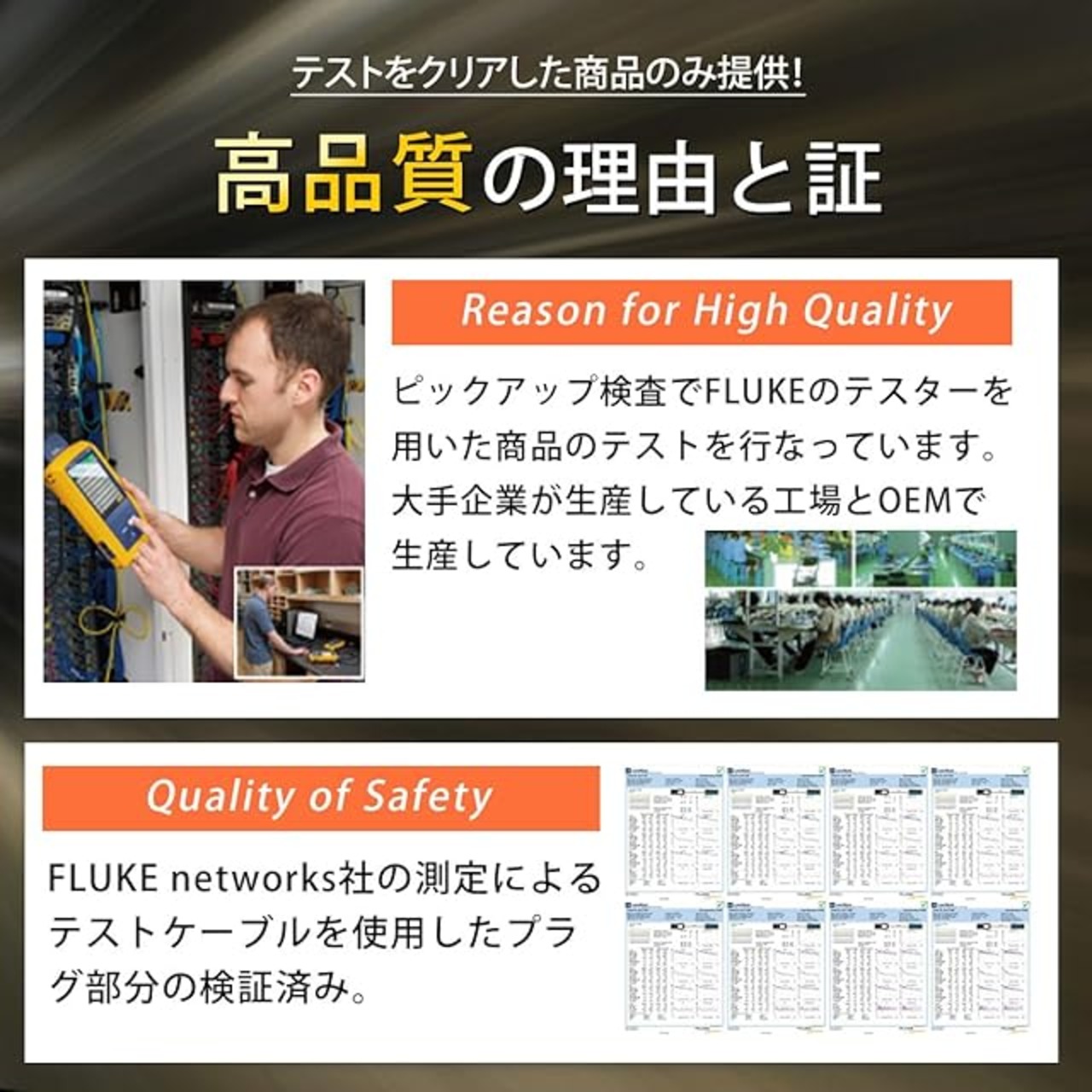 中間コスト削減・安定した品質:工場直接輸入で中間コストを完全カット。当社スタッフが定期的に現地に訪問して徹底した品質管理を行い、安心安全な商品を提供。※FLUKE networks社測定によるテストケーブル使用でプラグ部分の検証済み。