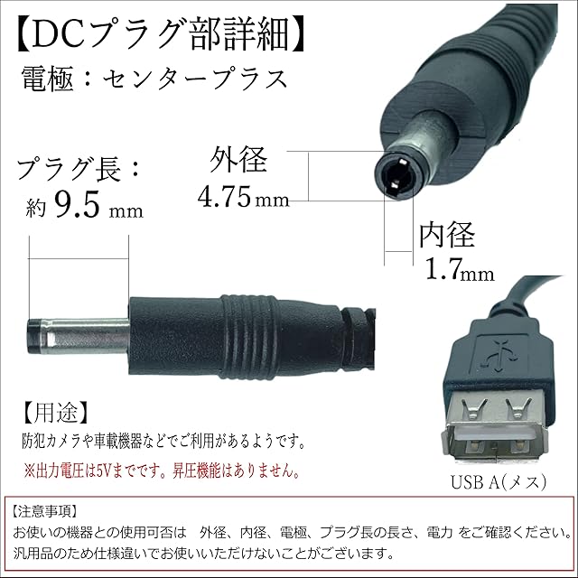 【仕様】 ■USB延長:USB A(メス) ■DCプラグ部:外径4.0/内径1.7mm(オス) ■動作電圧:最大 5V ※5Vを超えてのご利用はしないでください。機器の破損や高温になることがあります。 ■電極:センタープラス ■プラグ長:約9.5mm ■ケーブル長:約15cm
