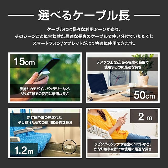 ケーブル内に2重シールドを使用し、高純度線芯を採用することで、導電性の向上により3Aの超急速充電に対応。またケーブル長もゆとりのある1.2m、これは新幹線や車の座席で充電しながらスマホを操作できる快適な長さです。