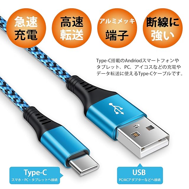 Viviber アンドロイド タイプc ケーブル Android 充電ケーブル スマホ ケーブル type-c usb タイプc ナイロン編み 高耐久 3A急速充電コード アンドロイドusbケーブル タイプc スマホ usb充電ケーブル galaxy/xperia/aquos/oppo/huaweiのタイプC機種対応(0.9m 青い) | AVENIR