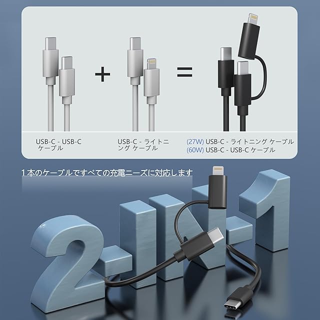 <p><b>2-IN-1 コイル状 USB-C - USB-C/Lightning ケーブル - PD 60W/27W 高速充電</b></p><p><b>特徴:</b></p><p></p><ul> <li>材質:TPE</li> <li>色: 黒</li> <li>車のために作られました: Apple CarPlay と Android Auto をサポートします。</li> <li>高速データ転送: 480Mbpsのデータ転送。</li> <li>2-IN-1 出力: iPhone iPad iPod iWatch Android Macbook ラップトップ用に作られました。</li> <li>PD 60W/27W USB-C 高速充電:(60W)MacBooK Pro 13 インチ /MacBooK Air 13 インチは 90 分で最大 100% 充電できます。 (27W) iPhone 15 は 30 分で最大 50% まで充電できます。</li> <li>PD 27W C94 超高速充電: iPhone 14 は 30 分で最大 50% まで充電できます。</li></ul><p><b>調節可能な長さ:</b></p><p></p><p>元の長さ - 約1.3フィート/0.4メートル</p><p>最大伸縮性 - 約6フィート/1.8メートル</p><p>快適なストレッチ - 2フィート~4フィート/0.6m~1.2m</p><p></p><p><b>Android Auto と Apple Carplay コンボ ケーブル</b></p><p></p><p><b>急速充電するにはどうすればよいですか?</b></p><p>スマートフォンの場合:</p><p></p><p>1.USB C 携帯電話は高速充電をサポートしている必要があります。</p><p>2.デバイスに応じてPD 3.0 (87W/65W/61W/45W/35W/30W/29W/27W/25W/20W/18W) USB C充電器を使用してください。</p><p>3. 当社のコイル状 USB-C to Lightning/USB-C ケーブル。</p><p>ラップトップの場合:</p><p></p><p>1.USB C ラップトップは高速充電をサポートしています。</p><p>2.PD 3.0 (100W/90W/87W/65W/61W/60W/45W) USB C 電源アダプターを使用します。</p><p>3. 当社のコイル状 USB-C to USB-C ケーブル。</p><p>お使いのデバイスが PD 充電プロトコルをサポートしているかどうかを、説明書または公式 Web サイトを通じて確認してください。</p><p></p><p>データ転送と充電の2 in 1 USB C ライトニングケーブル。</p><p>高品質のクアッドコア銅線は、最大 3A の充電速度と最大 480Mbps のデータ伝送速度をサポートしており、高速なデータ転送、同期、充電をお楽しみください。</p><p></p><p><b>人間工学に基づいて設計された 2-in-1 デザイン</b></p><p>プラグ可能な 2-in-1 出力インターフェイス設計により、1 本のケーブルで 2 つの充電ニーズに対応できます。</p><p>この Apple 認定コイル状ライトニング ケーブルは、ご自宅、職場、屋外パワーバンク、または D-JI Marvin Pro/Air ハンドル、および USB-C 出力を備えた最新の iPhone 15 シリーズ携帯電話に最適です。</p><p></p><p><b>重要なヒント:</b></p><p>USB-C PD 60W 充電器と組み合わせると、USB-C PD デバイスを最大 60W の高速充電できます。</p><p>iPhone 8 以降のバージョンの iPhone のみが PD 急速充電をサポートできます。その他の iPhone は標準充電 (最大 5V/2.4A) のみをサポートします。</p><p>USB-Cデバイスの場合は、公式WebサイトまたはマニュアルでPD充電に対応しているかどうかを確認してください。</p><p>iPhone 15 の最大充電速度は最大 27W です (iPhone 15 シリーズの充電に 27W の充電器を使用したデータに基づく内部テスト)。</p><p>携帯電話ケースが少し厚い場合は、携帯電話ケースを外して充電ケーブルを使用すると、デバイスによりよく適応できます。</p><p>良好な伸縮性を維持するために、最初はラインがきついのが通常ですが、数回使用するとラインの柔軟