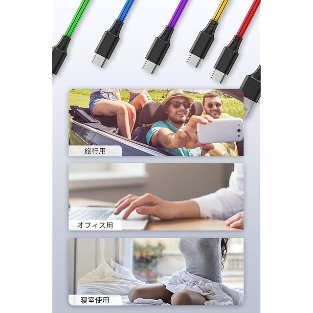 このUSB Type C ケーブルは、5本セットで2メートルのロングタイプで、通常のケーブルよりも長く、延長コードが不要です。急速充電対応で、高速データ転送も可能な、高品質なケーブルです。また、高耐久な素材を使用し、幅広い端末に対応しています。