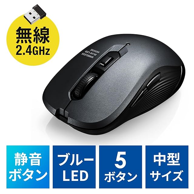 【仕様】接続方式:2.4GHzワイヤレス RF電波方式(※マウスとレシーバー間のIDは固定です。) 通信範囲:木製机(非磁性体)/半径約10m スチール机(磁性体)/半径約2m コネクタ形状:USBコネクタ(Aタイプ) 分解能:800・1200・1600カウント/インチ 読み取り方式:ブルーLEDセンサー方式 ボタン数:5ボタン(進むボタン、戻るボタン、ホイール(スクロール)ボタン、カウント切替えボタン)