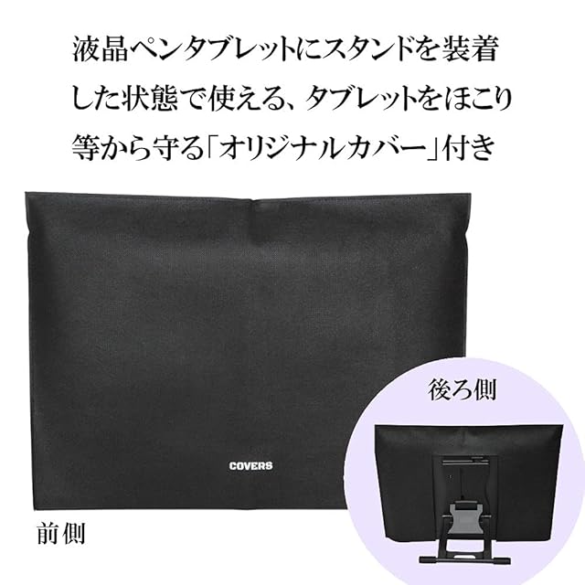 液晶ペンタブレットにスタンドを装着した状態で使え、タブレットを埃から守るオリジナル保護カバー付き。
