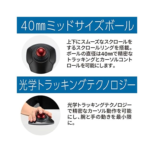 40㎜ミッドサイズボールでコントロール:ウェブサイトやWordドキュメントを上下にスムーズにスクロールするのに役立つスクロールリングを搭載。ボールの直径は40㎜で精密なトラッキングとカーソルコントロールを可能にします。