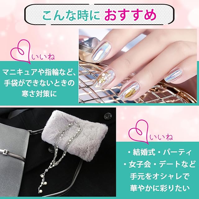 マニキュアや指輪など、手袋の使用が出来ないときの寒さ対策に。パーティ・女子会・デートなど手元をオシャレで華やかに彩りたいときに。秋冬の防寒対策のマストアイテムです。