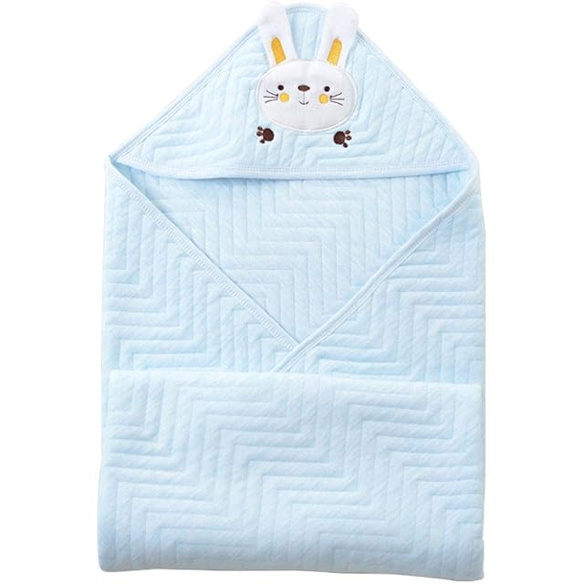 出産準備や、出産祝いのギフトとしても喜ばれている、うさぎちゃんのアップリケがとっても可愛いキルティングおくるみです。生地はコットン100%のやさしい肌触り。軽くて扱いやすいポリエステル中綿入りで、ふんわりと優しく赤ちゃんを包みこみます。厚すぎず、薄すぎず、持ち運びにもかさばらないので、春夏秋冬、四季を通して一年中、様々な用途にお使いいただけます。三角形のフードもあるので、太陽の光や風から、大切な頭もカバーします。