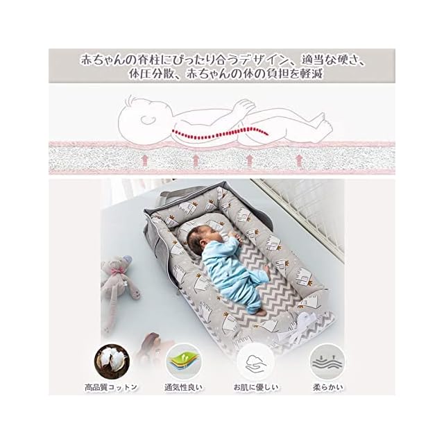 【赤ちゃんにより良い睡眠を与える】ベビーベッドは、肌に優しく通気性があり、無害である優れた綿で作られています。活性染色技術を採用されていることで、とても安全で色も褪せず、赤ちゃんに安らかに眠れるようにしています。ベビーベッドは赤ちゃんの背骨にフィットするように設計されており、背骨がバランスの取れた力を受け、赤ちゃんにストレスなしで良い睡眠を与えます。