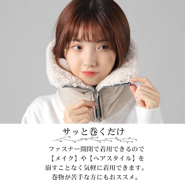 ファスナー付きネックウォーマーだから頭からかぶる事もなく髪形やメイク崩れを気にしないで済む楽ちんさがとても魅力